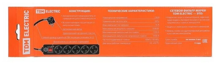 Сетевой фильтр TDM ELECTRIC СФ-05В (SQ1304-0003), 5 розеток, с/з, 16А / 3500 Вт черный 5 м 276 мм 50 мм 40 мм 1 м² 5