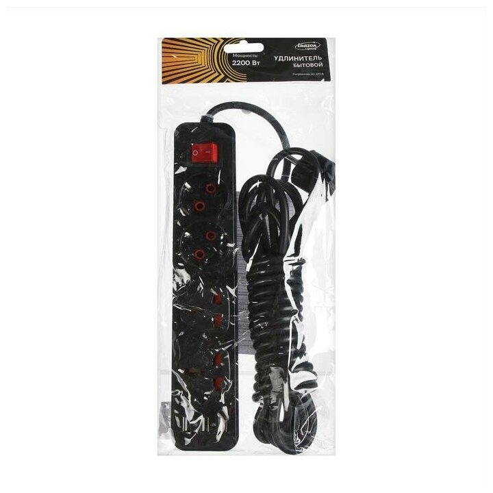Сетевой фильтр Luazon Lighting 4457529, 6 розеток, 5 м, с/з, 10А / 2200 Вт