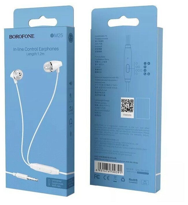Проводные наушники BOROFONE BM25 Sound edge, Jack 3.5mm, 1.2 м, белый