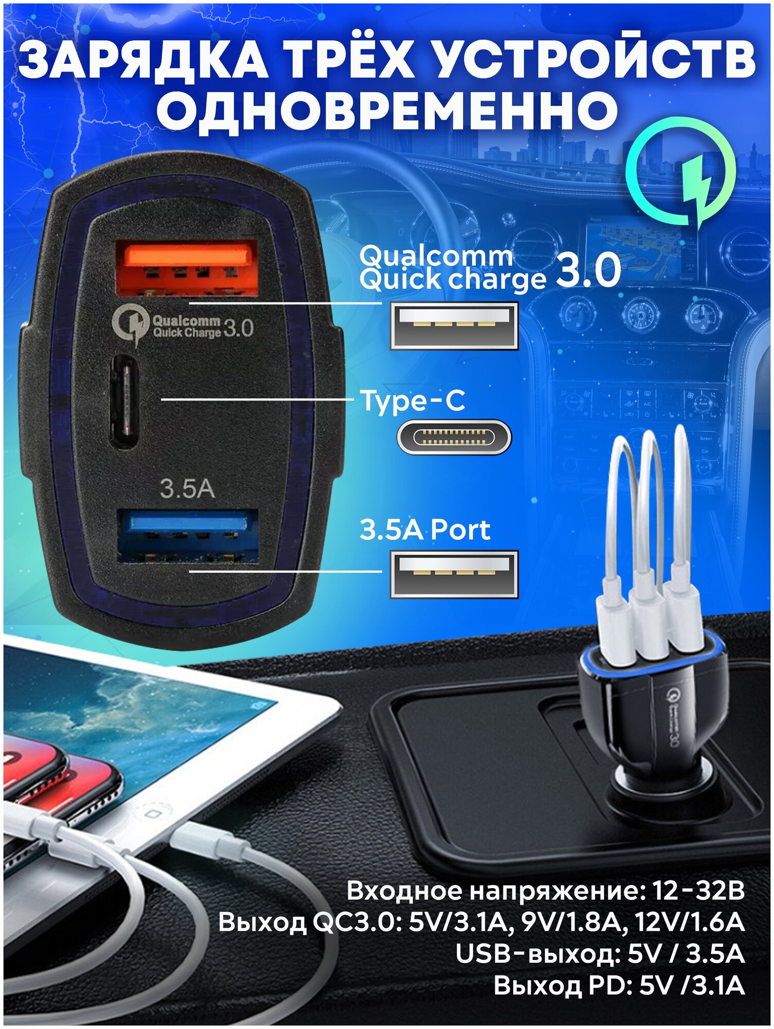 Автомобильное зарядное устройство для телефона 7А / Быстрая зарядка QC3.0 2USB х 3.1 А + Type C PD20W / зарядка для iphone / зарядка в прикуриватель информация: