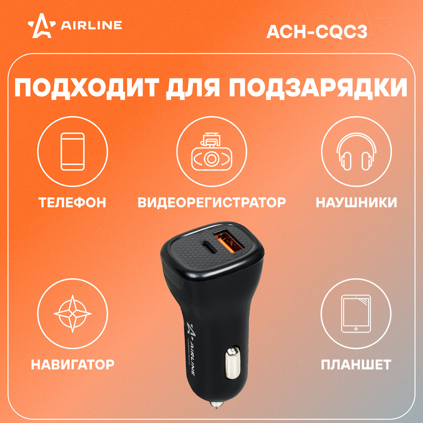 AIRLINE ACH-CQC3 Адаптер автомобильный Type-C PD + QC 3.0 42Вт макс. 5-12В 3А макс. 12/24В (ACH-CQC3)