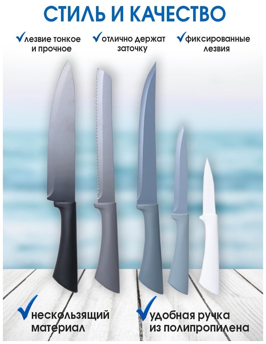 | Типы ножей в наборе | нож для овощей, нож для сыра, нож для томатов, нож для хлеба, разделочный нож, универсальный нож, филейный нож, шеф-нож |