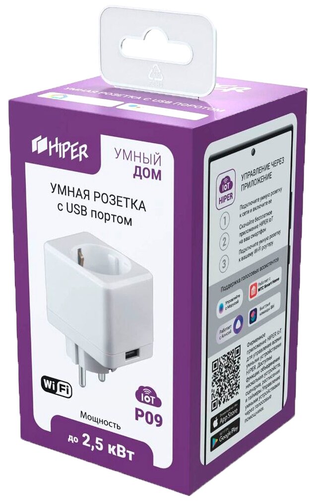 HIPER Smart socket IOT P09/Умная розетка с USB поротом/Wi-Fi/AC 100-250В/10А/50-60 Гц/2500 Вт