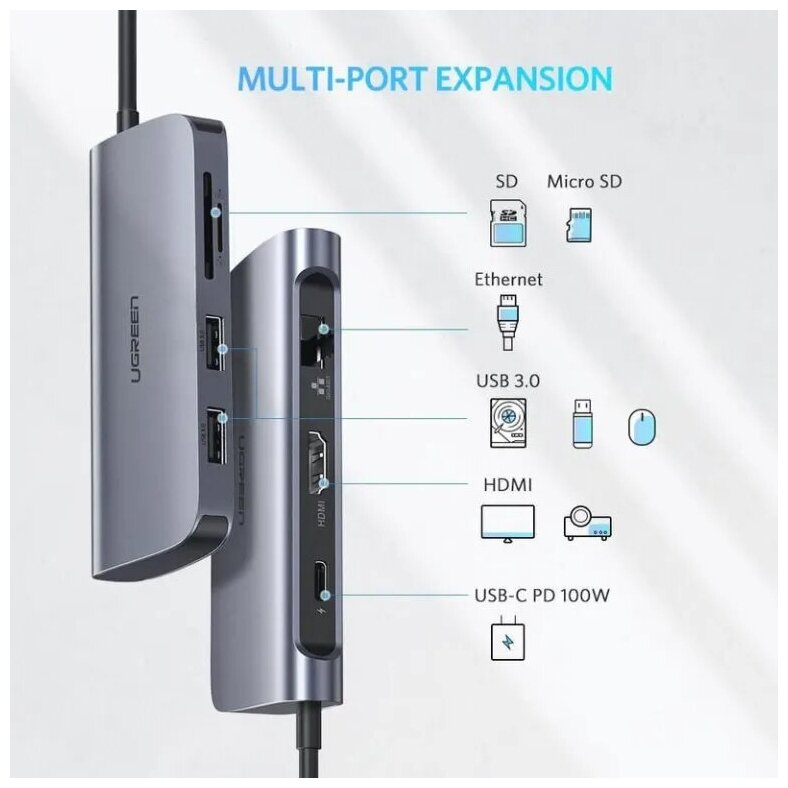 UGREEN. USB концентратор 7 в 1 (хаб), 2 x USB 3.0, HDMI, RJ45, SD/TF, PD (50852) информация: