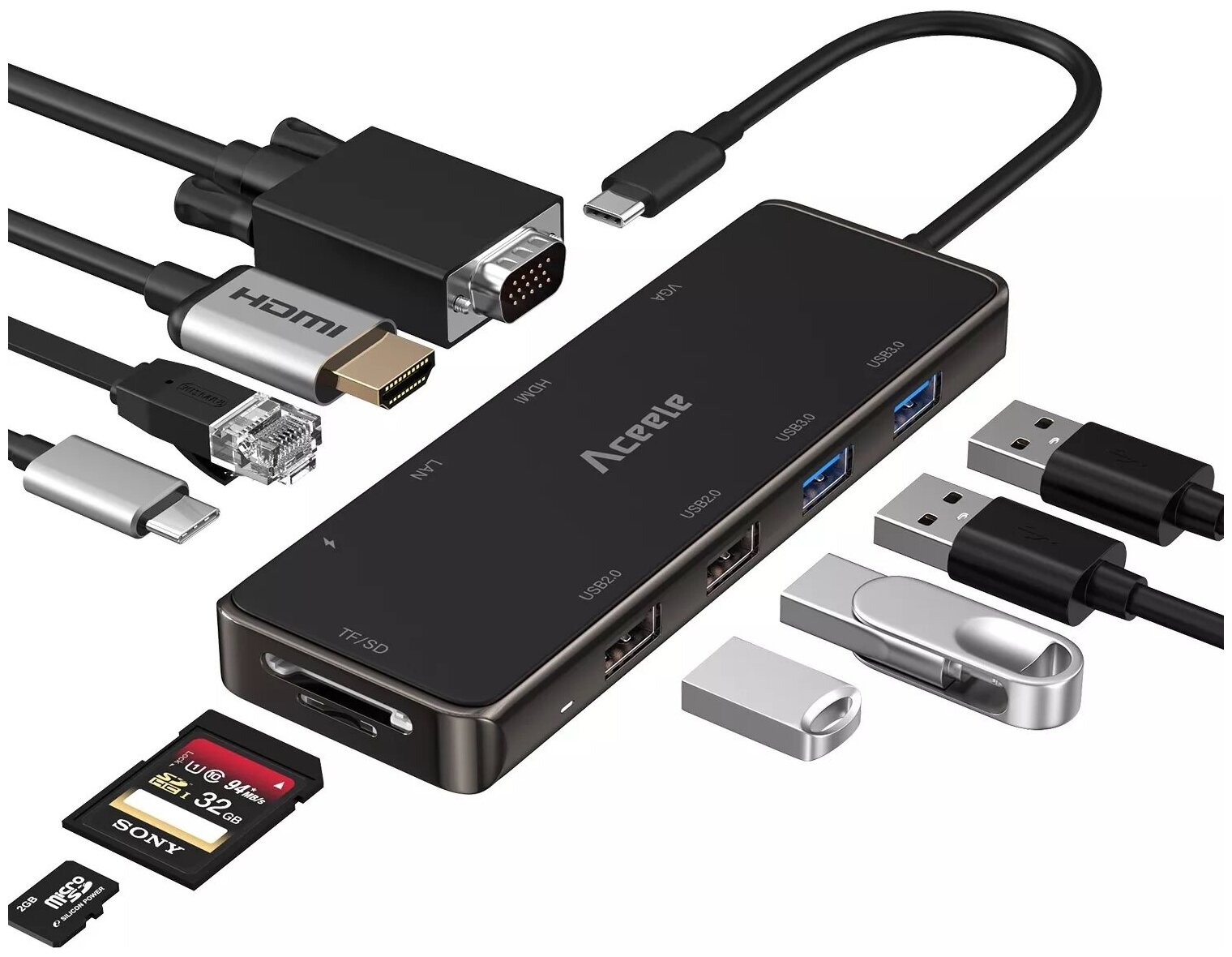 10 цен на Хаб USB-концентратор ACEELE 10 в 1 (PD+VGA+HDTV+ Ethernet+TF/SD+2xUSB3.0+2хUSB2.0) Multifunctional Type-C