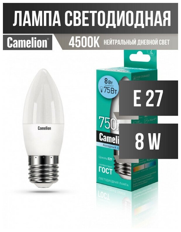 Camelion Свеча E27 8W(750lm 220°) 4500K 4K матов. 106x37 пластик LED8-C35/845/E27 (арт. 575463) информация: