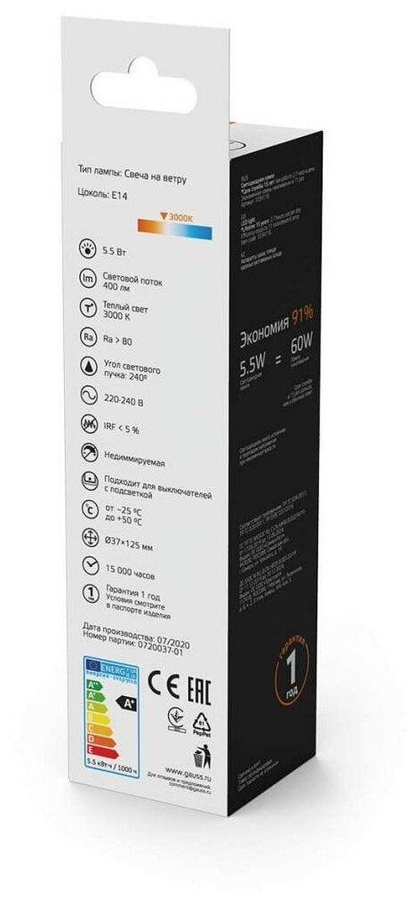 Типы/Лампочки/Светодиодные Gauss Лампа светодиодная Gauss E14 5,5W 3000К матовая 1034116 информация: