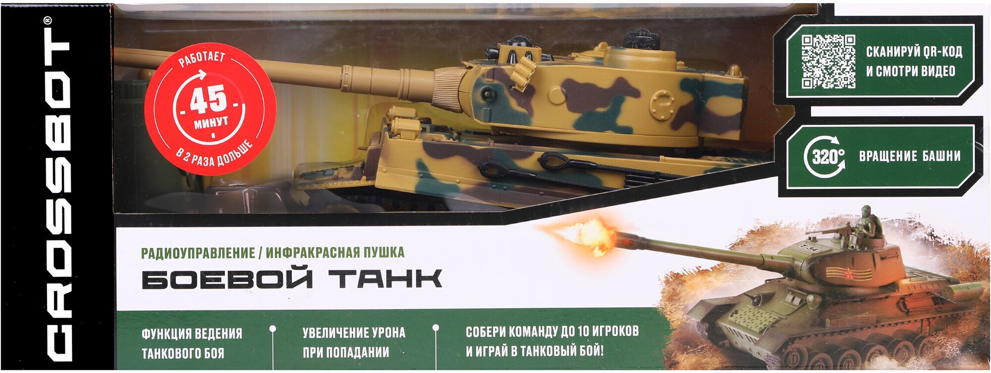 | Дополнительная информация | танк осуществляет движение вперёд и назад, поворачивает вправо и влево, преодолевает подъёмы под углом 45°, совершает круговое вращение на месте и поворот башни вправо-влево на 320°; в игрушке предусмотрены демонстрационный режим и автоотключение; танк оснащён функцией боя |