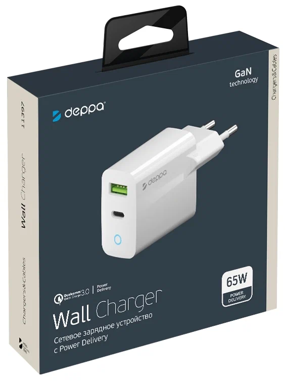 Сетевое зарядное устройство с USB A + Type-C Power Delivery 3.0, Quick Charge 3.0, 65W, GaN, Deppa бел информация: