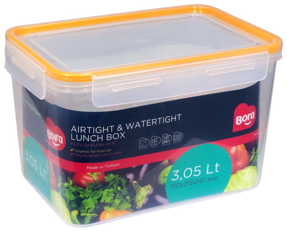 Контейнер герметичный прямоугольный 3.05л ДхШхВ 150х215х140 мм крышка на защелках полоса оранжевая пластик BORA 1 шт информация: