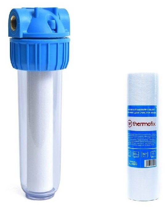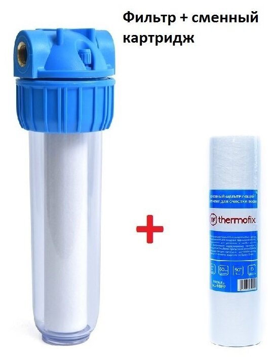 Комплект Магистральный фильтр "Thermofix" (1/2" колба с гайкой, 10", с картриджем) + картридж (полипропилен,10 мкн) / фильтр воды информация: