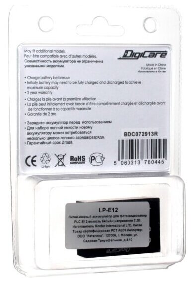 Аккумулятор для фотоаппарата Digicare PLC-E12 / LP-E12 / EOS M информация: