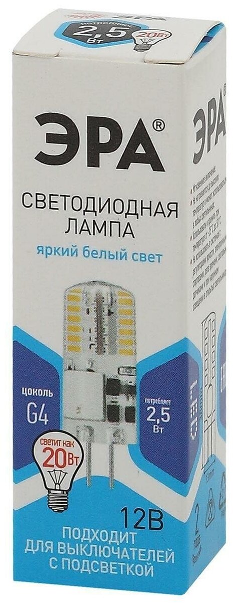 Отзывы на Типы/Лампочки/Светодиодные ЭРА Лампа светодиодная ЭРА G4 2,5W 4000K прозрачная LED-JC-2,5W-12V-SLC-840-G4 Б0049090