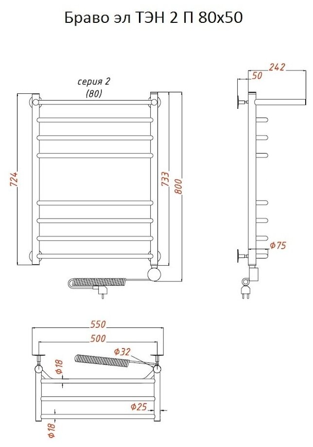 Полотенцесушитель электрический Тругор 550х800мм форма лесенка 7 перекладин универсальное подключение информация: