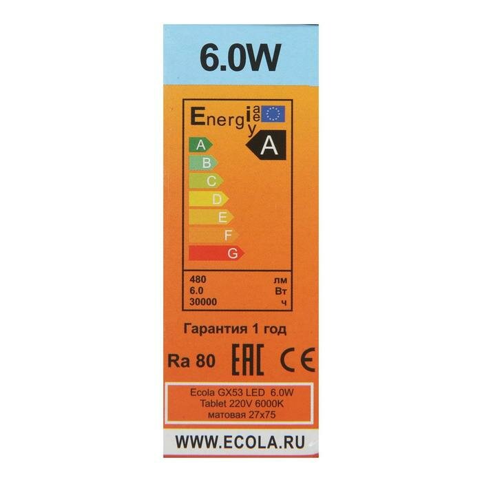 Лампа светодиодная Ecola Tablet, GX53, 6 Вт, 6000 К, 220 В, 27x75 мм, матовое стекло информация: