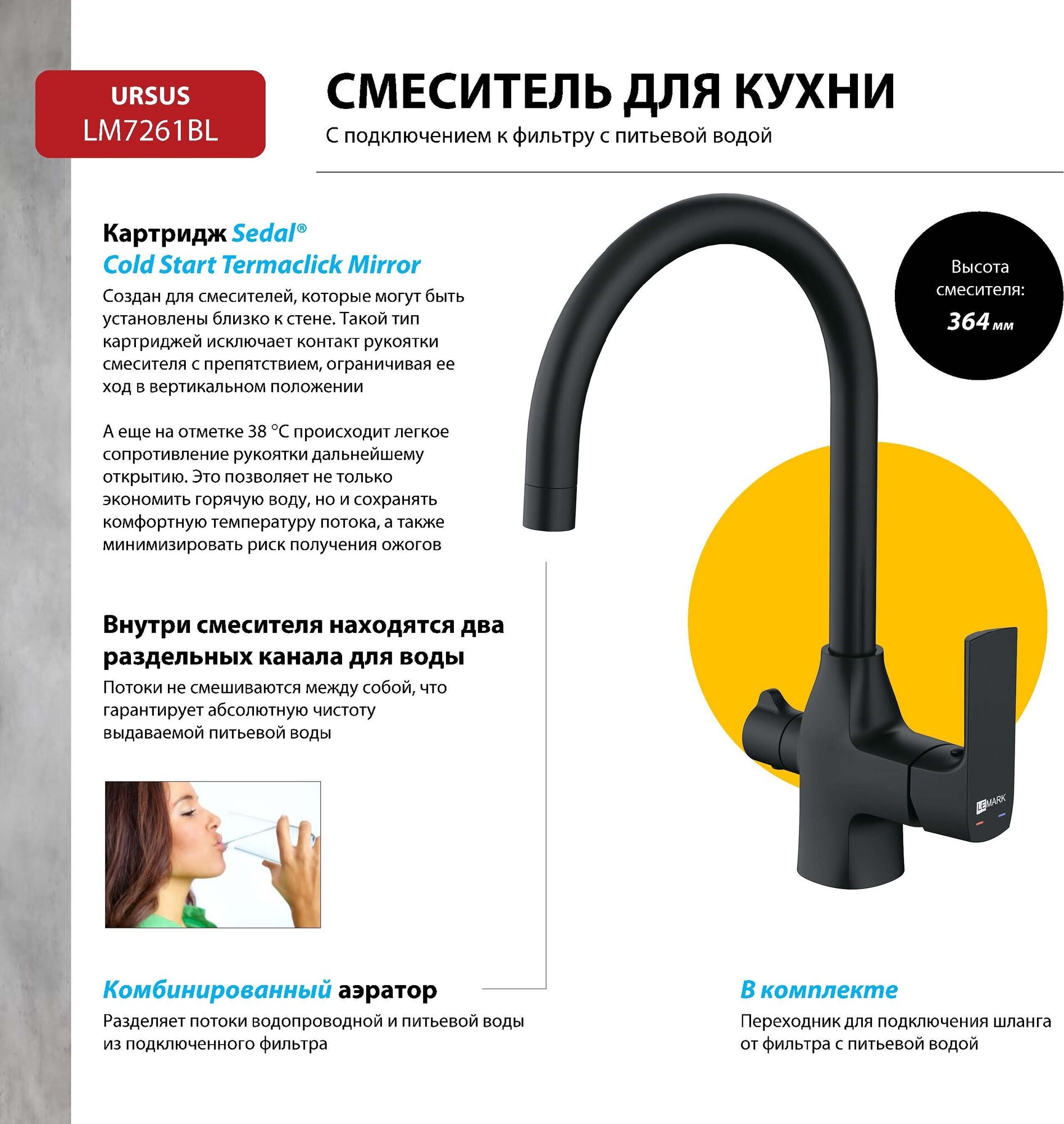 Смеситель Lemark Ursus LM7261BL для кухни с подключением к фильтру с питьевой водой информация: