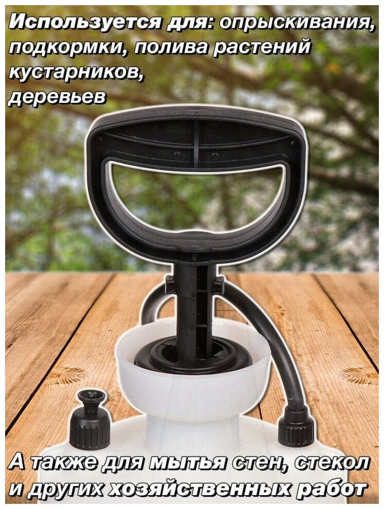 | Дополнительная информация | Опрыскиватель "Шмель" 5л. 0,5м. с металлической удочкой предназначен для распыления лекарственных веществ и удобрений, для плодовых деревьев, садовых и огородных растений. Распыление происходит за счет создания давления внутри емкости. Помповый насос позволяет создать давление до трех атмосфер. Вес баллона с распылителем составляет всего 1.5 килограмма. На баллоне есть клапан для стравливания лишнего давления. Регулировка мощности струи на ручке пистолета распылителя. Гибкий резиновый шланг и распылитель длиной 50 сантиметров. |