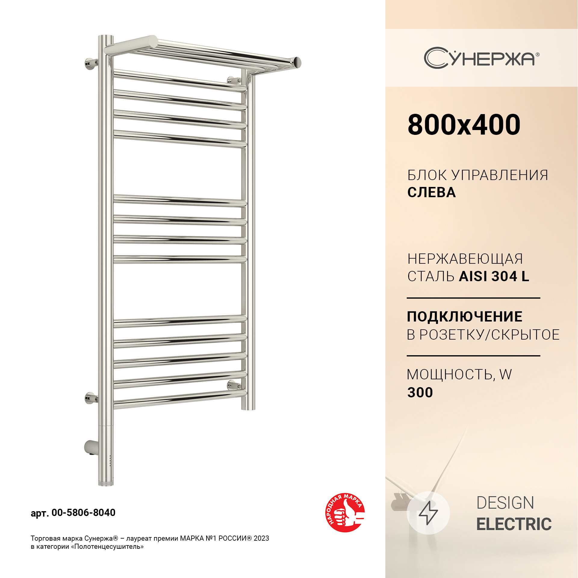 Полотенцесушитель электрический Сунержа Богема 3.0, 800x400, МЭМ левый, с полкой, сталь полированная 00-5806-8040 30 400 ₽