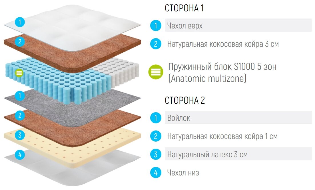 | Наполнитель | комбинированный (натуральная кокосовая койра + натуральный латекс 3 см) |