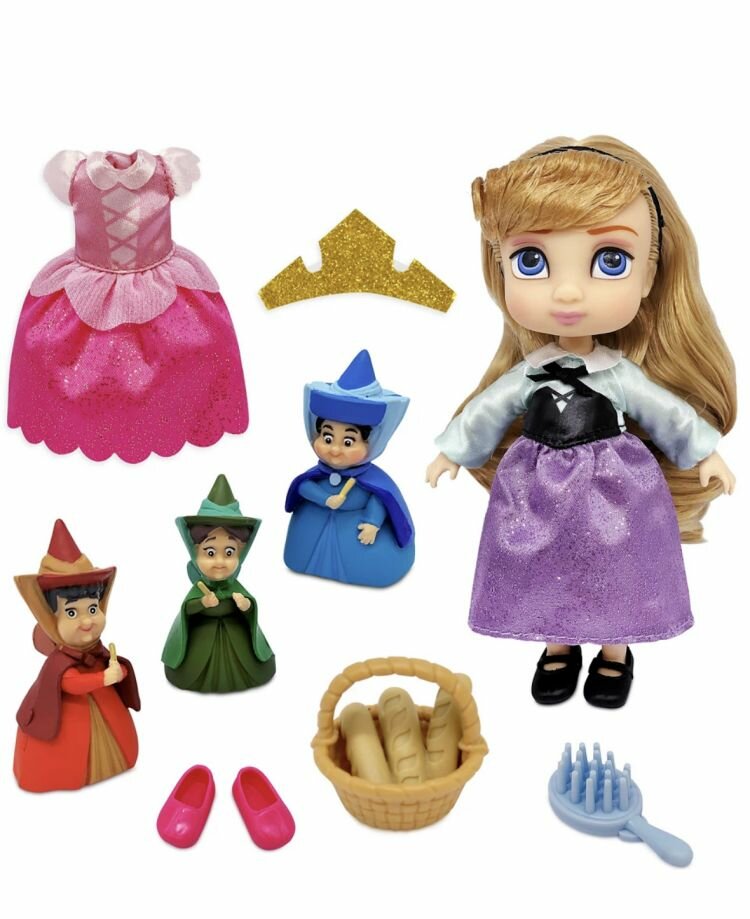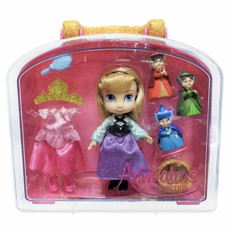 | Комплектация | Коллекция Диснеевских аниматоров мини кукла Аврора Два костюма Крестьянское платье "Шиповник" с повязкой на голове, туфлями и корзинкой Платье принцессы Авроры с короной и туфлями Расческа для волос Флора, фауна и фигуры Мерривезера |