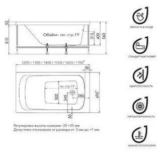 Акриловая ванна 1ACReal Gamma 120х70 с ножками (Щ0000028714, Щ0000029976) информация: