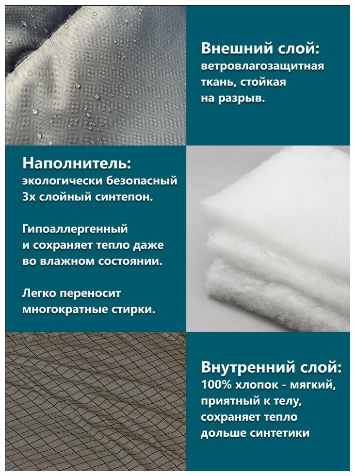 | Характеристики внешнего материала | 210D, WR/PU1000, 80гр/м2, 100пэ |