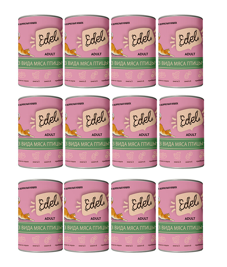 Влажный корм для кошек Edel Cat консервы нежные кусочки в соусе 3 вида мяса птицы 0,4кг (12 шт)