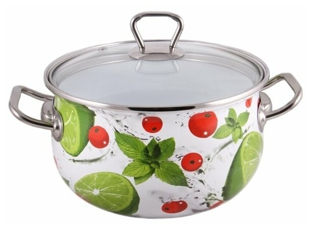 Кастрюля эмалированная 1,5 л с ободком белая с рисунком Фруктовая фантазия