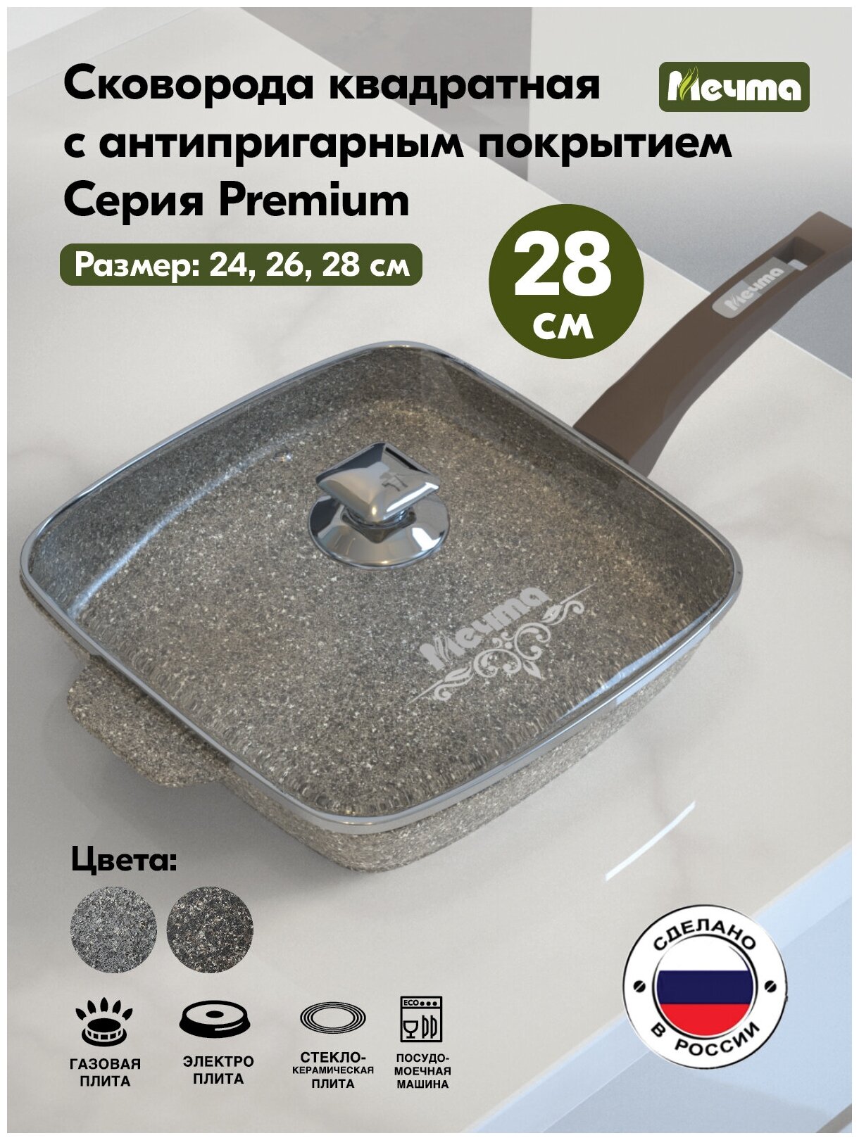 Сковорода квадратная "Мечта" 28*28см Премиум с антипригарным покрытием с несъемной ручкой и крышкой, можно мыть в посудомоечной машине информация: