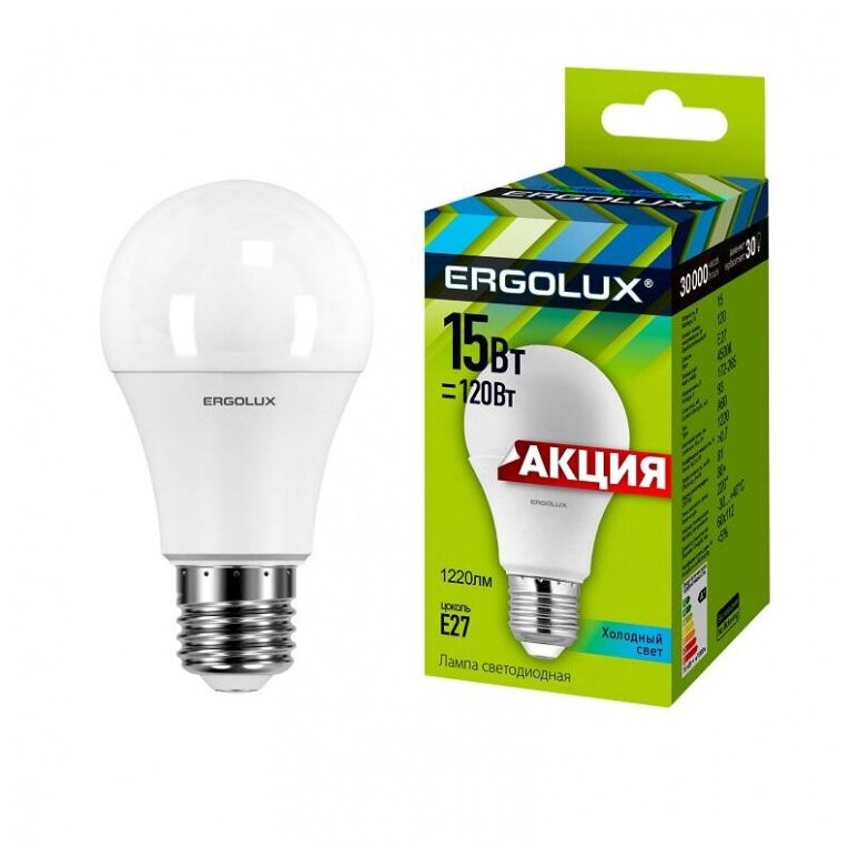 Лампа светодиодная E27, 15 Вт, 120 Вт, 220 В, груша, 4500 К, свет холодный белый, Ergolux