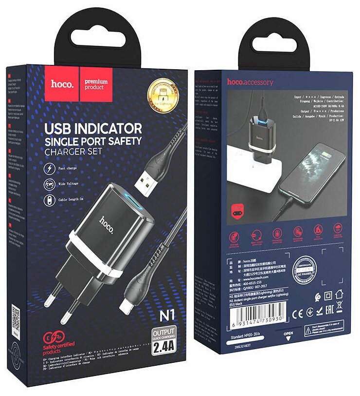 Сетевое зарядное устройство HOCO N1 Ardent 1xUSB, 2.4А, LED + USB кабель Type-C, 1м (черный) информация: