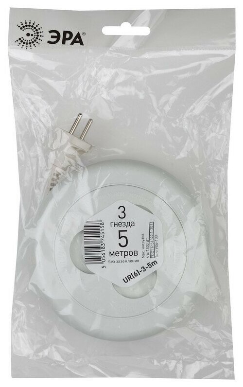ЭРА UR(6)-3-5m ЭРА рулетка без заземл., 3гн, 5м, ШВВП, 2x0.75мм2, 6А(УХ6-103) (5/20/600)