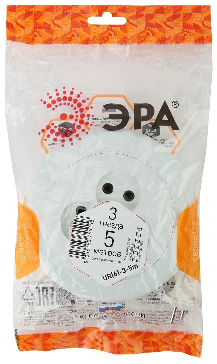 Типы/Электротовары/Удлинители и сетевые фильтры ЭРА Удлинитель ЭРА UR(6)-3-5m Б0035762 информация: