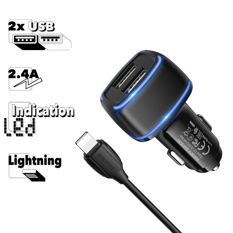 Автомобильное зарядное устройство BOROFONE BZ14 Max 2xUSB, 2.4A, LED + кабель Lightning 8-pin, 1м, черный информация: