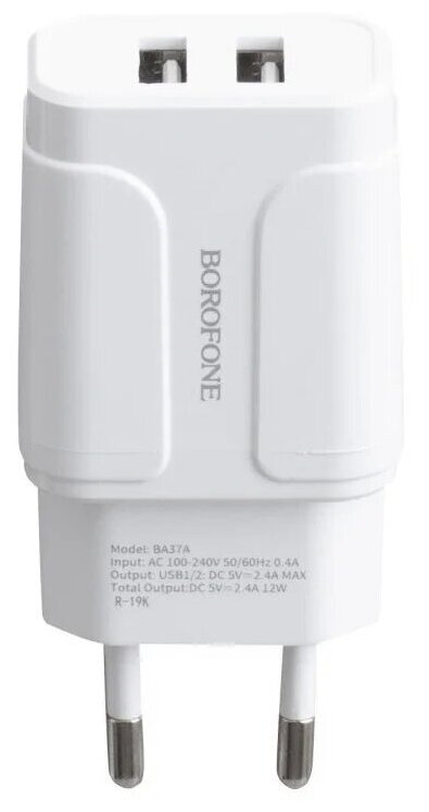 Borofone BA37A сетевое зарядное устройство (с кабелем Type-C) с 2 USB выходами 5В, 2400mAh, белый