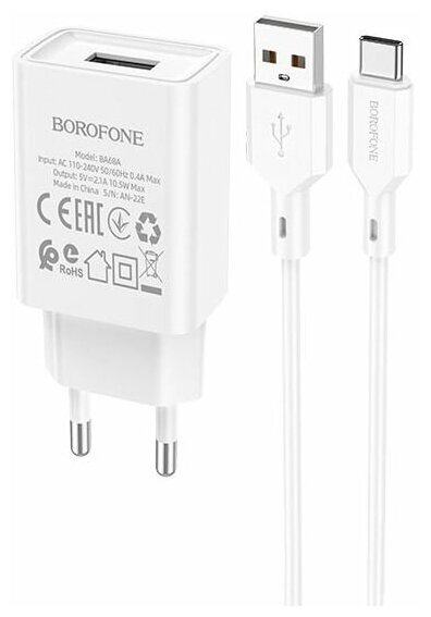 Сетевое зарядное устройство BOROFONE BA68A Glacier 1xUSB, 2.1А + кабель USB Type-C, 1м (черный) информация: