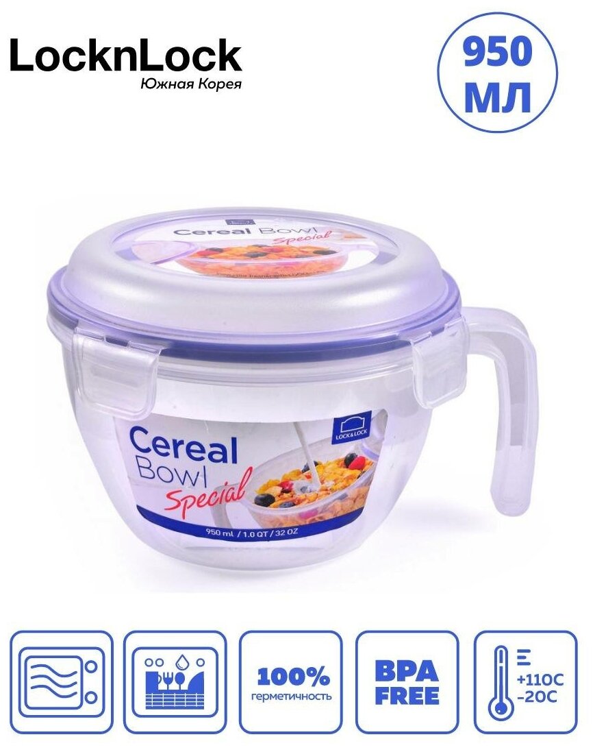 Контейнер/Миска с ручкой для хранения пищевых продуктов "LocknLock", герметичный, 950 мл. информация: