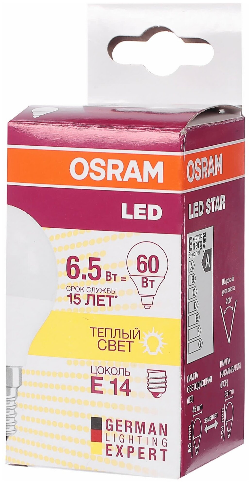 Отзывы на Лампа светодиодная Osram Шар E14 6.5 Вт 550 Лм свет тёплый белый