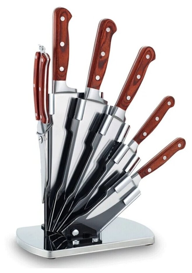 | Комплектация | нож-топорик 19 см, нож поварской 20 см, нож хлебный 20 см, нож для резки 12 см, нож овощной 9см, ножницы, подставка |