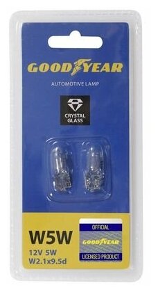 GOODYEAR (аксессуары) GY015206 Лампа накаливания Goodyear W5W 12V 5W W2.1x9.5d (блистер: к-т 2шт.) информация: