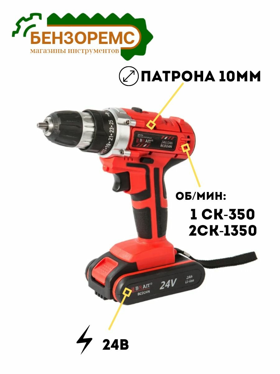 Дрель-шуруповерт аккумуляторная BRAIT BCD24N (24В Li-ion,2акк,1.5Ач,30Нм,подстветка,реверс,кейс) информация: