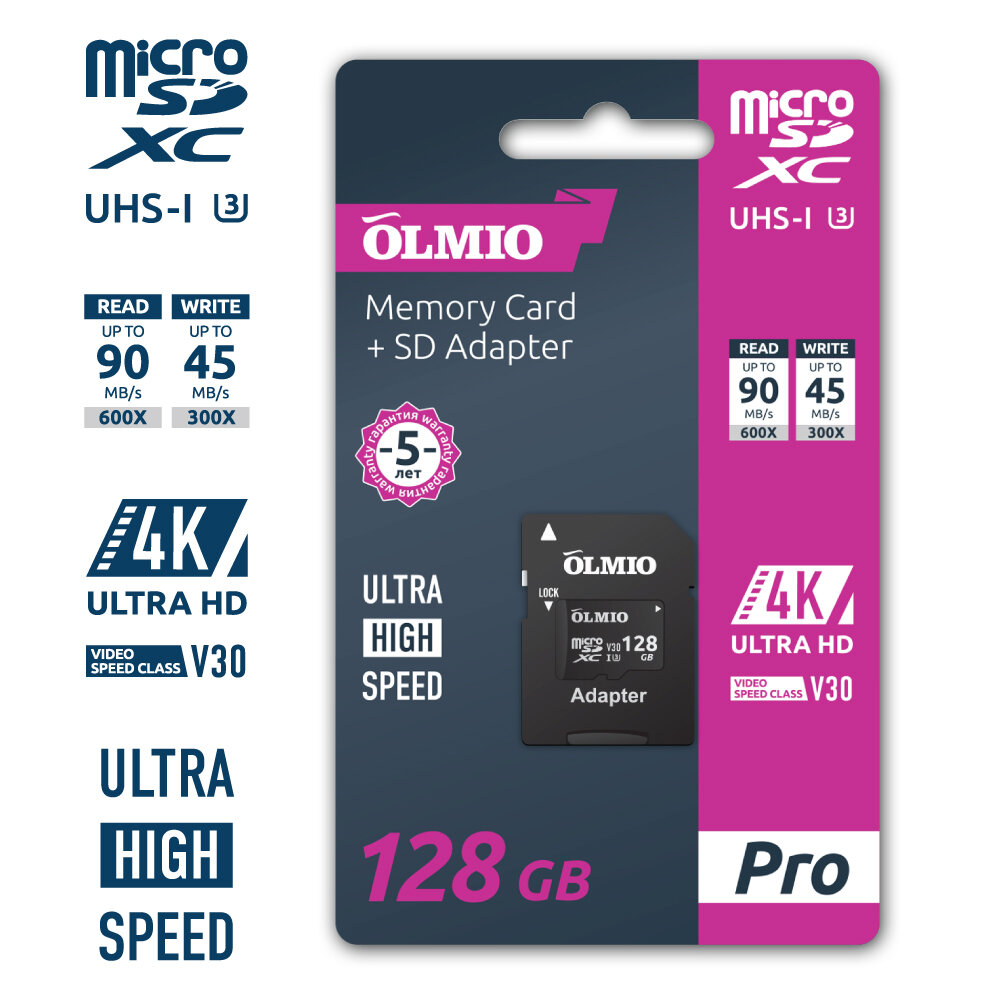 10 цен на Карта памяти microSDXC 128GB UHS-I U3 V30, c адаптером, OLMIO,