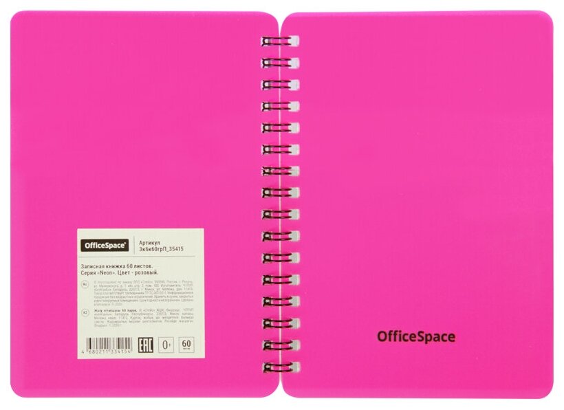 Записная книжка А6 60л. на гребне OfficeSpace "Neon", розовая пластиковая обложка, 3 шт. в упаковке информация: