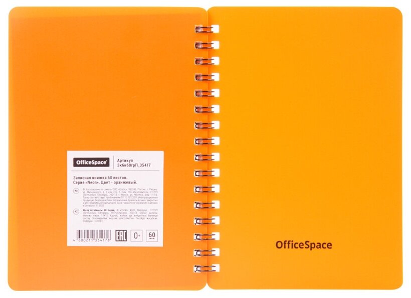 Записная книжка А6 60л. на гребне OfficeSpace "Neon", оранжевая пластиковая обложка, 3 шт. в упаковке информация: