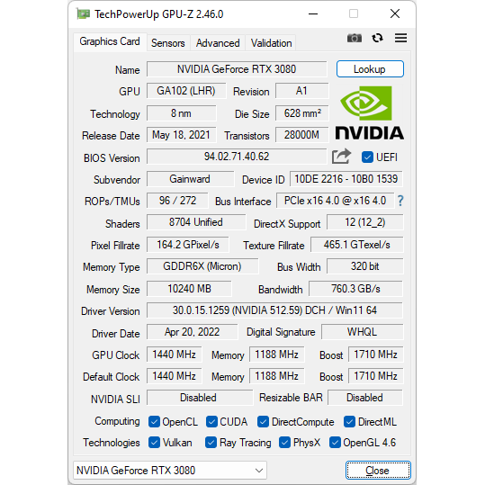| Название видеокарты | NVIDIA GeForce RTX 3080 |