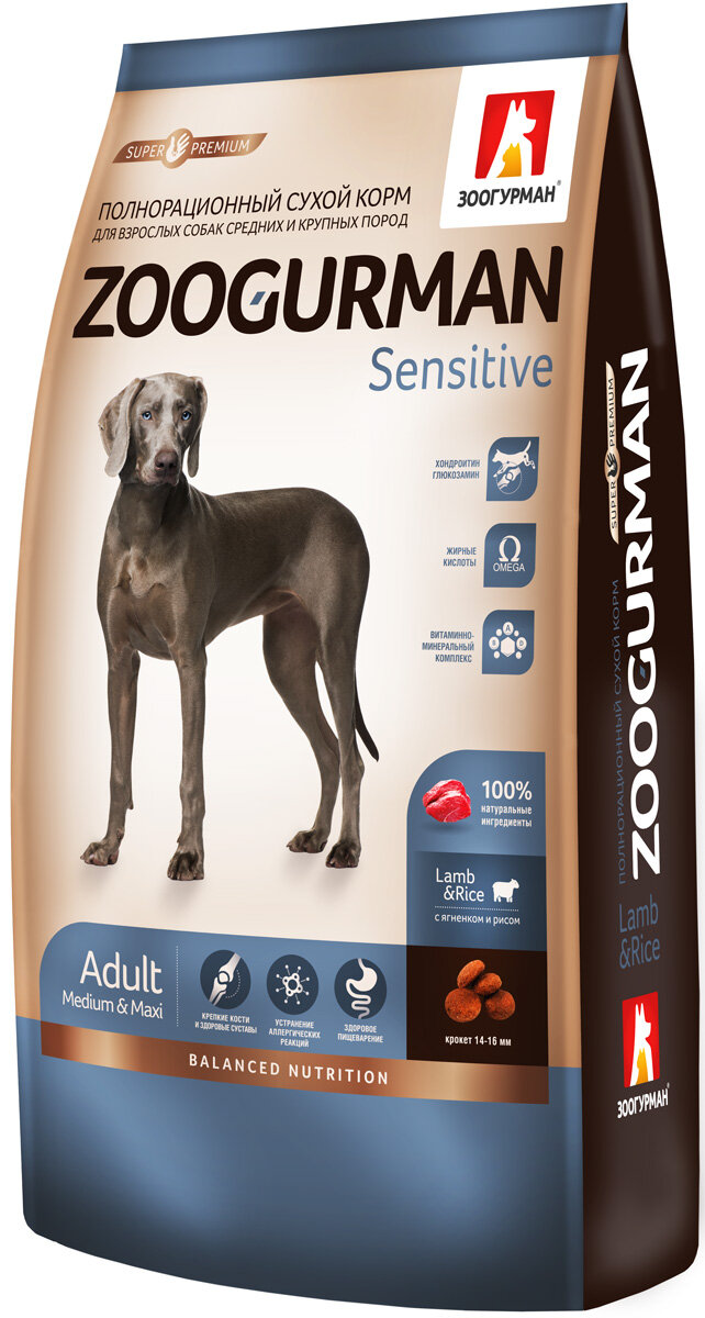 Zoogurman Sensitive - Сухой корм для взрослых собак средних и крупных пород, ягненком (12 кг)