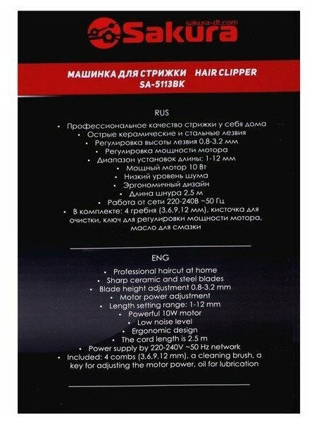 Машинки для стрижки SAKURA Машинка для стрижки Sakura SA-5113BK Professiоnal, 10 Вт, 1-12 мм, 4 насадки 220 В, чёрная 2 400 ₽