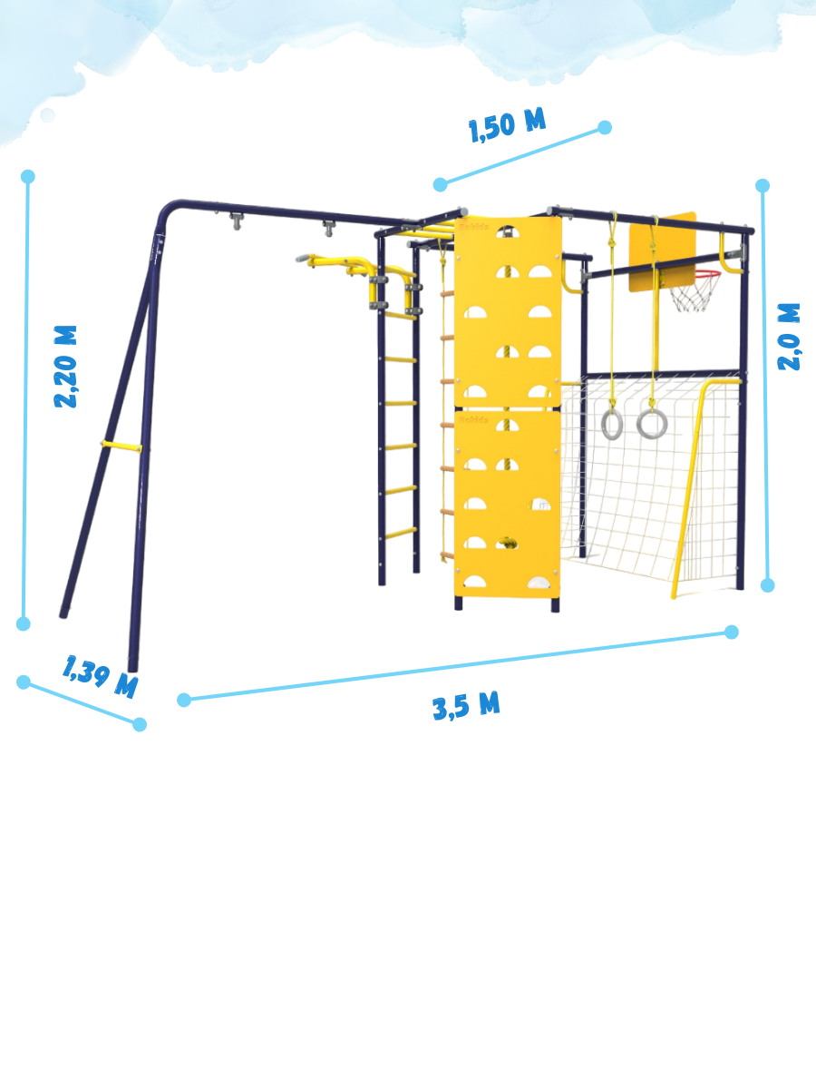 | Комплектация | рукоход, турник, ворота, скалодром, кольцо баскетбольное, кольца гимнастические, канат, лестница веревочная, трапеция, подшипниковые опоры для качели |