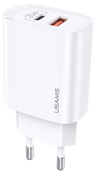 Сетевое зарядное устройство Usams CC121 с функцией одновременной быстрой зарядкой двух устройств Fast Charger QC 3.0 + PD 3.0, 20W, адаптер для iPhone 12 с Type C и USB12 портами. Цвет-белый