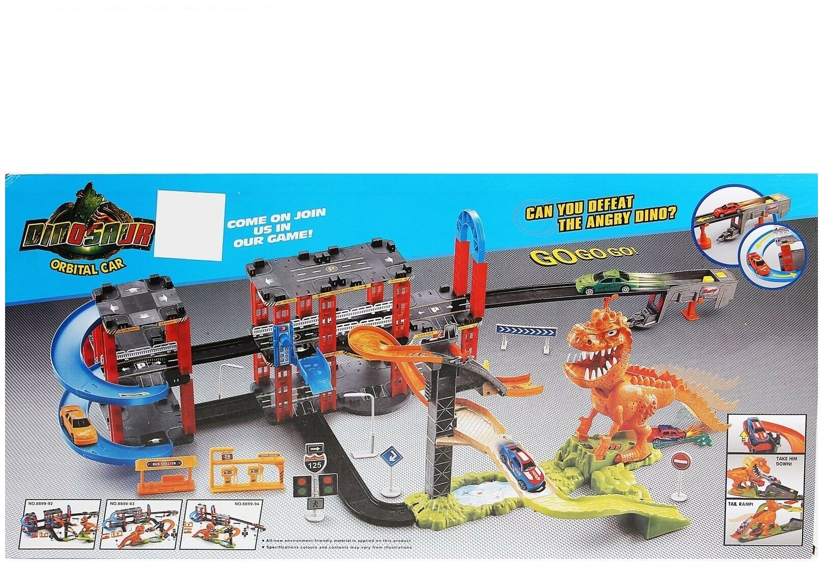 | Комплектация | - автотрек; - динозавр; - 2 металлические машины (7 х 3 х 2,7 см); - остановка; - автозаправка; - комплект знаков и ограждений; - автозапуск; - комплект наклеек; - 3 батарейки AG13. |